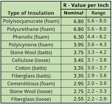 The effectiveness of thermal insulation increases by the thickness of the layer of insulation. The following table shows the per inch increase in R Value of different materials. The R-value in insulation refers to the material's thermal resistance or its ability to resist the flow of heat. It measures how effectively an insulation material can prevent heat from passing through it. The higher the R-value, the greater the material's insulating effectiveness.