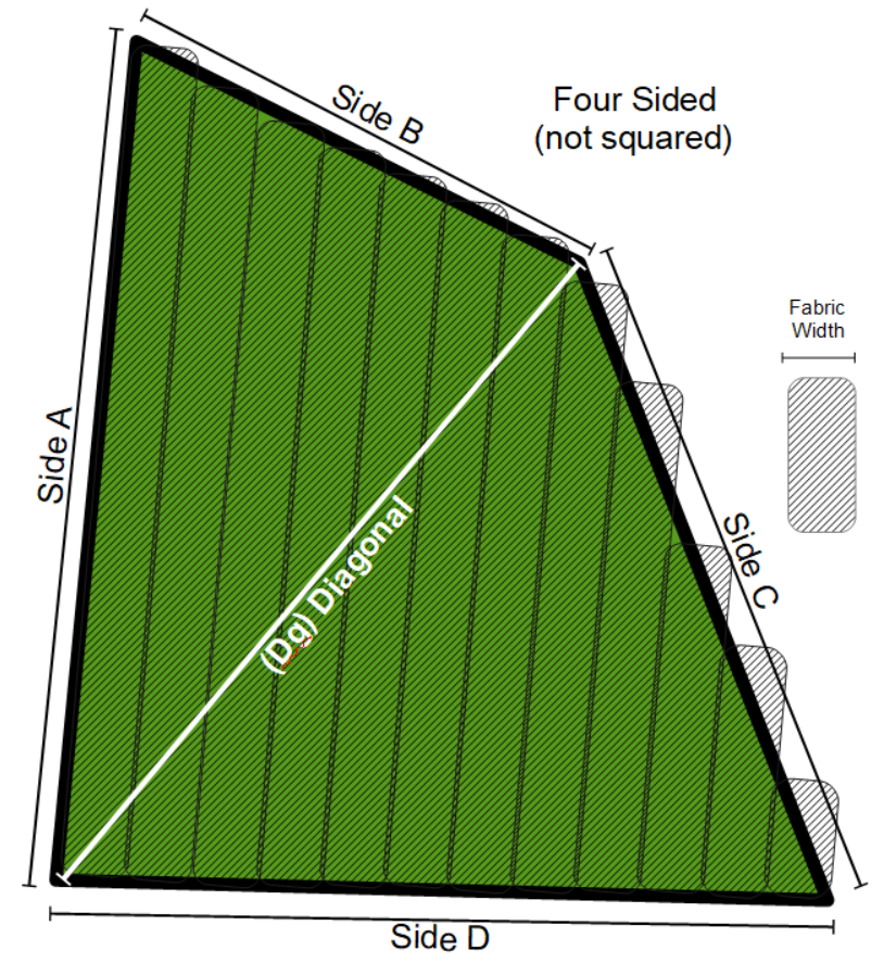 A four sided area is considered a quadrilateral. The calculator computes the area of the quadrilateral using the length of the four sides and the diagonal. It then computes the number of rolls of garden/landscaping fabric by dividing the area by the area in a standard roll of garden fabric.