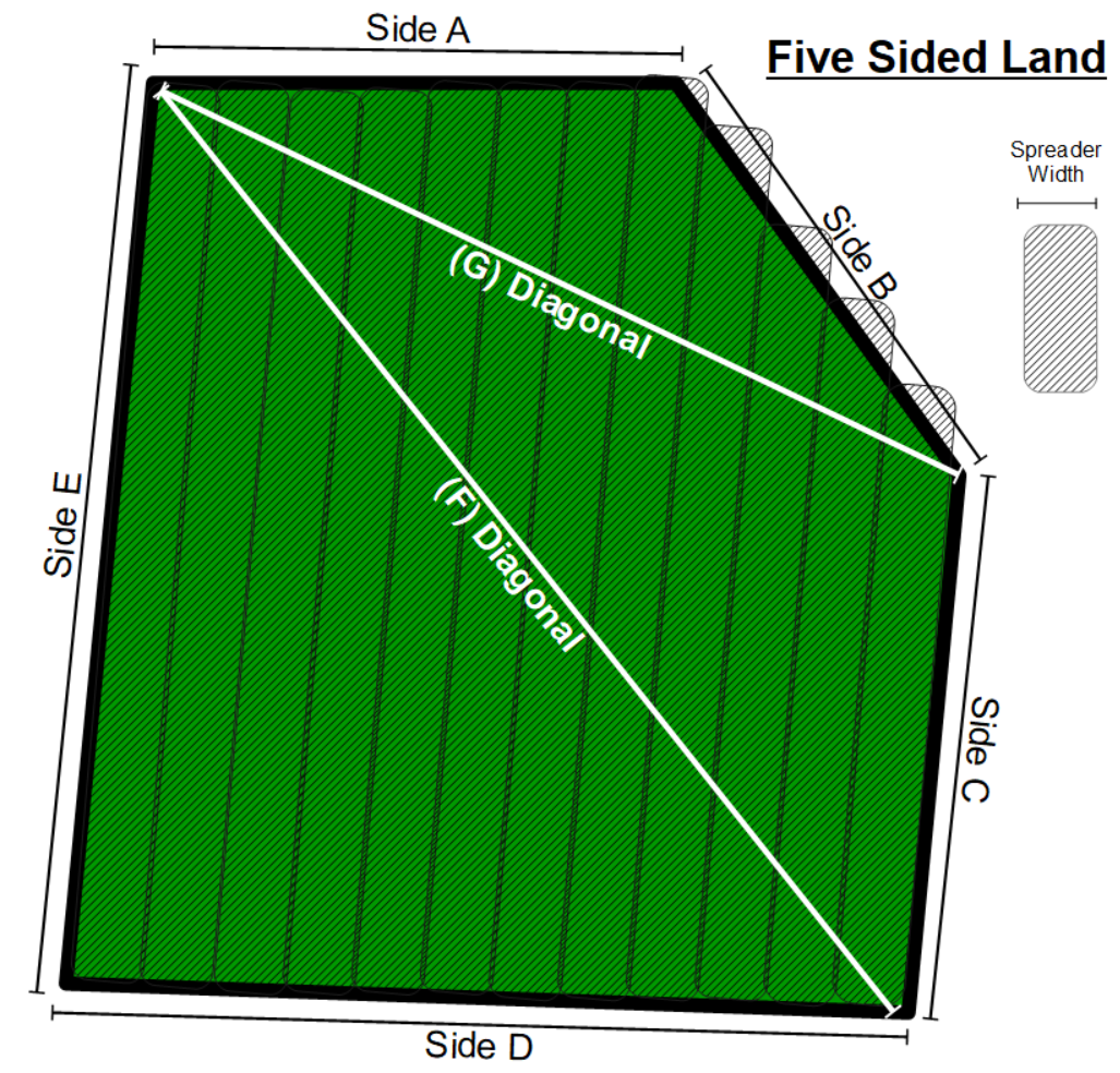 The Lawn Spreader Five Sided Land calculator computes the number of bags of lawn treatment (grass seed, weed killer, lawn fertilizer) needed for a five sided lawn based on the manufacturer recommended area of coverage per bag and the length of the five sides and two diagonals of the lawn.