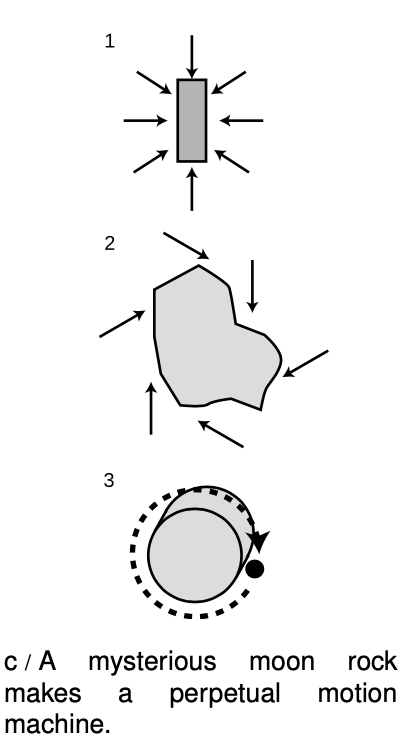 The analysis based on friction is somewhat superficial, however. One could understand friction perfectly well and yet imagine the following situation. Astronauts bring back a piece of magnetic ore from the moon which does not behave like ordinary magnets. A normal bar magnet, c/1, attracts a piece of iron essentially directly toward it, and has no left- or right-handedness. The moon rock, however, exerts forces that form a whirlpool pattern around it, 2. NASA goes to a machine shop and has the moon rock put in a lathe and machined down to a smooth cylinder, 3. If we now release a ball bearing on the surface of the cylinder, the magnetic force whips it around and around at ever higher speeds. Of course there is some friction, but there is a net gain in speed with each revolution.