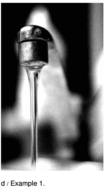 In figure d, the stream of water is fatter near the mouth of the faucet, and skinnier lower down. This is because the water speeds up as it falls. If the cross-sectional area of the stream was equal all along its length, then the rate of flow through a lower cross-section would be greater than the rate of flow through a cross-section higher up. Since the flow is steady, the amount of water between the two cross-sections stays constant. The cross-sectional area of the stream must therefore shrink in inverse proportion to the increasing speed of the falling water. This is an example of conservation of mass.