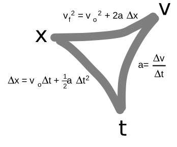 The symmetry among the three variables is imperfect only because the equation relating `x` and `t` includes the initial velocity.