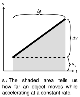 Although the area-under-the-curve technique can be applied to any graph, no matter how complicated, it may be laborious to carry out, and if fractions of rectangles must be estimated the result will only be approximate. In the special case of motion with constant acceleration, it is possible to find a convenient shortcut which produces exact results. When the acceleration is constant, the v - t graph is a straight line, as shown in the figure. The area under the curve can be divided into a triangle plus a rectangle, both of whose areas can be calculated exactly: `A=b⋅h` for a rectangle and `A=1/2 b*h` for a triangle. The height of the rectangle is the initial velocity, `v_o`, and the height of the triangle is the change in velocity from beginning to end `Deltav`. The object's `Deltax` is therefore given by the equation `Deltax=v_o Deltat +1/2 (Deltav)/(Deltat) * Deltat^2` . This can be simplified a little by using the definition of acceleration, `a`= `Deltav`/`Deltat`, to eliminate `Deltav`, giving