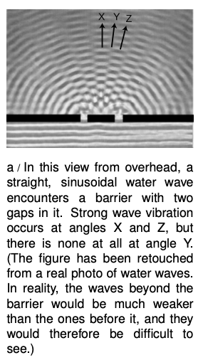 (3) In figure a we can see that the wave pattern immediately beyond the barrier is rather complex, but farther on it sorts itself out into a set of wedges separated by gaps in which the water is still. We will restrict ourselves to studying the simpler wave patterns that occur farther away, so that the main question of interest is how intense the outgoing wave is at a given angle.