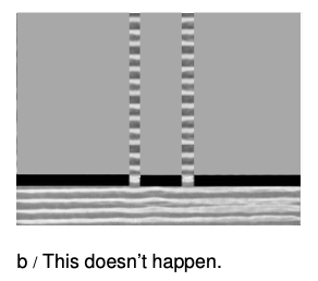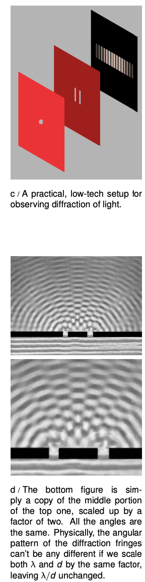 Figure a shows a typical problem in wave optics, enacted with water waves. It may seem surprising that we don't get a simple pattern like figure b, but the pattern would only be that simple if the wavelength was hundreds of times shorter than the distance between the gaps in the barrier and the widths of the gaps.