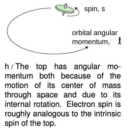 This may seem paradoxical because the quantum moat, for instance, gave only angular momenta that were integer multiples of `ℏ`, not half-units, and I claimed that angular momentum was always quantized in units of `ℏ`, not just in the case of the quantum moat. That whole discussion, however, assumed that the angular momentum would come from the motion of a particle through space. The `ℏ"/"2` angular momentum of the electron is simply a property of the particle, like its charge or its mass. It has nothing to do with whether the electron is moving or not, and it does not come from any internal motion within the electron. Nobody has ever succeeded in finding any internal structure inside the electron, and even if there was internal structure, it would be mathematically impossible for it to result in a half-unit of angular momentum.