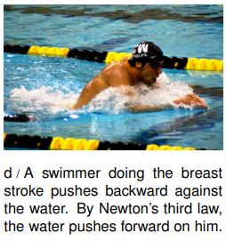 Figure d analyzes swimming using Newton's third law. Do a similar analysis for a sprinter leaving the starting line. (answer in the back of the PDF version of the book)