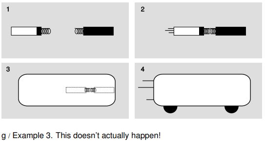 If we could violate Newton's third law, we could do strange and wonderful things. Newton's third laws says that the unequal magnets in figure a on p. 154 should exert equal forces on each other, and this is what we actually find when we do the experiment shown in that figure. But suppose instead that it worked as most people intuitively expect. What if the third law was violated, so that the big magnet made more force on the small one than the small one made on the big one? To make the analysis simple, we add some extra nonmagnetic material to the small magnet in figure g/1, so that it has the same mass and size as the big one. We also attach springs. When we release the magnets, g/2, the weak one is accelerated strongly, while the strong one barely moves. If we put them inside a box, g/3, the recoiling strong magnet bangs hard against the side of the box, and the box mysteriously accelerates itself. The process can be repeated indefinitely for free, so we have a magic box that propels itself without needing fuel. We can make it into a perpetual-motion car, g/4. If Newton's third law was violated, we'd never have to pay for gas!