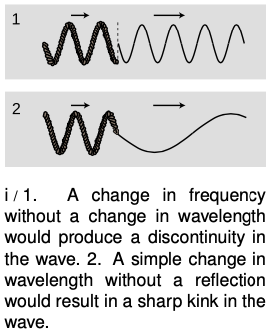 To understand the fundamental reasons for what does occur at the boundary between media, let's first discuss what doesn't happen. For the sake of concreteness, consider a sinusoidal wave on a string. If the wave progresses from a heavier portion of the string, in which its velocity is low, to a lighter-weight part, in which it is high, then the equation tells us that it must change its frequency, or its wavelength, or both. If only the frequency changed, then the parts of the wave in the two different portions of the string would quickly get out of step with each other, producing a discontinuity in the wave, i/1. This is unphysical, so we know that the wavelength must change while the frequency remains constant, 2.