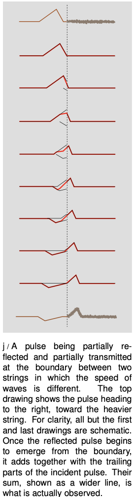 We conclude that without positing partial reflection of the wave, we cannot simultaneously satisfy the requirements of (1) continuity of the wave, and (2) no sudden changes in the slope of the wave. (The student who has studied calculus will recognize this as amounting to an assumption that both the wave and its derivative are continuous functions.)