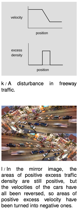 Let's start by considering wave disturbances of freeway traffic. Anyone who has driven frequently on crowded freeways has observed the phenomenon in which one driver taps the brakes, starting a chain reaction that travels backward down the freeway as each person in turn exercises caution in order to avoid rear-ending anyone. The reason why this type of wave is relevant is that it gives a simple, easily visualized example of how our description of a wave depends on which aspect of the wave we have in mind. In steadily flowing freeway traffic, both the density of cars and their velocity are constant all along the road. Since there is no disturbance in this pattern of constant velocity and density, we say that there is no wave. Now if a wave is touched off by a person tapping the brakes, we can either describe it as a region of high density or as a region of decreasing velocity.
