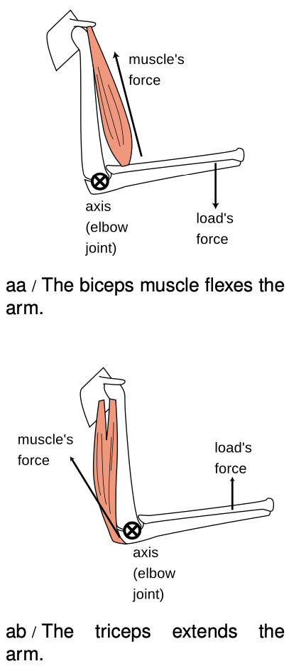 Although we have discussed some simple machines such as the pulley, without the concept of torque we were not yet ready to address the lever, which is the machine nature used in designing living things, almost to the exclusion of all others. (We can speculate what life on our planet might have been like if living things had evolved wheels, gears, pulleys, and screws.) The figures show two examples of levers within your arm. Different muscles are used to flex and extend the arm, because muscles work only by contraction.