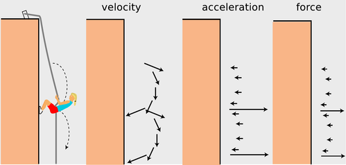 In figure e, the rappeller's velocity has long periods of gradual change interspersed with short periods of rapid change. These correspond to periods of small acceleration and force, and periods of large acceleration and force.