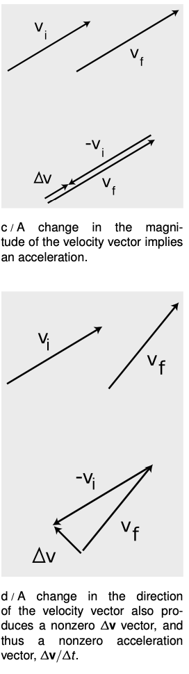 Now there are two ways in which we could have a nonzero acceleration. Either the magnitude or the direction of the velocity vector could change. This can be visualized with arrow diagrams as shown in figures c and d. Both the magnitude and direction can change simultaneously, as when a car accelerates while turning. Only when the magnitude of the velocity changes while its direction stays constant do we have a `Deltav` vector and an acceleration vector along the same line as the motion.
