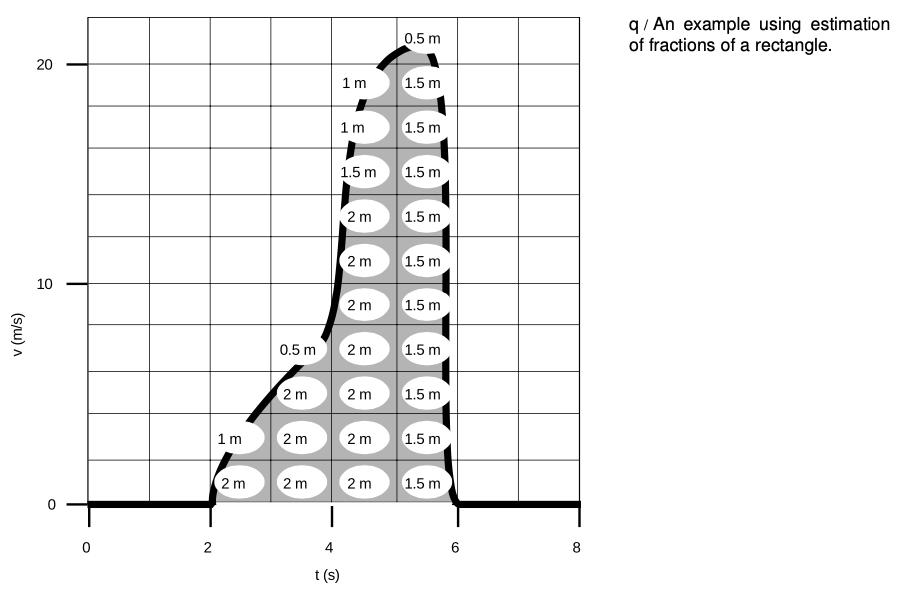 That's what I've done in figure q. Each rectangle on the graph paper is 1.0 s wide and `2 m"/"s` tall, so it represents 2 m. Adding up all the numbers gives `Deltax=41 m`. If you needed better accuracy, you could use graph paper with smaller rectangles.