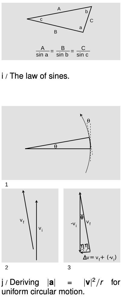 In this section I derive a simple and very useful equation for the magnitude of the acceleration of an object undergoing constant acceleration. The law of sines is involved, so I've recapped it in figure i.