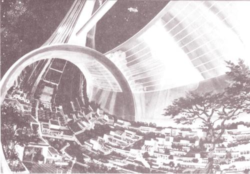 l / Discussion question B. An artist's conception of a rotating space colony in the form of a giant wheel. A person living in this noninertial frame of reference has an illusion of a force pulling her outward, toward the deck, for the same reason that a person in the pickup truck has the illusion of a force pulling the bowling ball. By adjusting the speed of rotation, the designers can make an acceleration `|v|^2"/"r` equal to the usual acceleration of gravity on earth. On earth, your acceleration standing on the ground is zero, and a falling rock heads for your feet with an acceleration of `9.8 m"/"s^2`. A person standing on the deck of the space colony has an upward acceleration of `9.8 m"/"s^2`, and when she lets go of a rock, her feet head up at the non-accelerating rock. To her, it seems the same as true gravity.