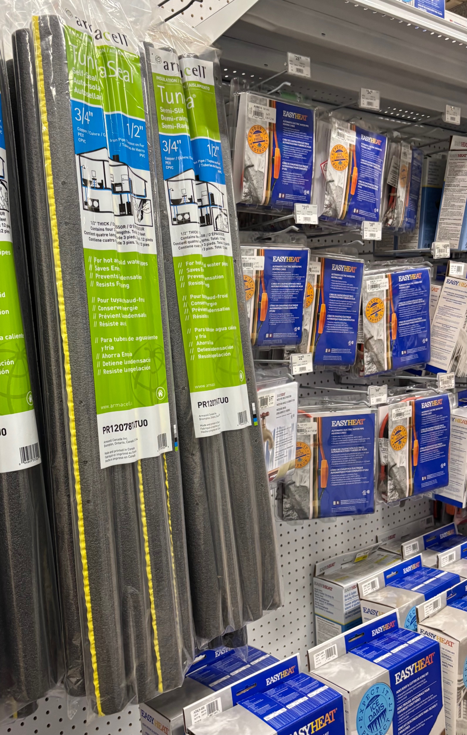 The standard bag of pipe insulation has four lengths of three foot long hard foam insulation tubes with a slit to slip over a pipe. The formula for number of bags of pipe insulation is: