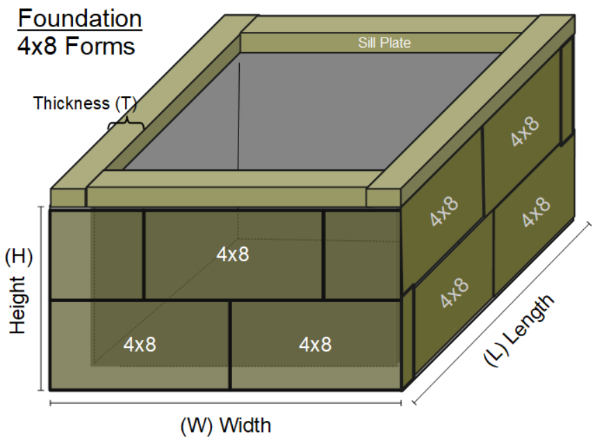 : Compute the volume of concrete, the square feet of the forms and the number of 4'x8's needed for the forms.