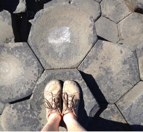 Giant's Causeway's hexagons: Using this equation and the fact that the shoe in the picture is approximately 12" long and that the side of the hexagon is approximately the length of the shoe, the AREA of these regular hexagons is 2.5 ft2.