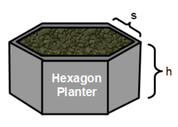 The Hexagon Planter Volume calculator computes the volume of a hexagon shaped planter. Enter the length of a side of the planter (s) and the (h) height of the interior of the container (see diagram), then this formula will provide the volume of the container. This answers the following questions: