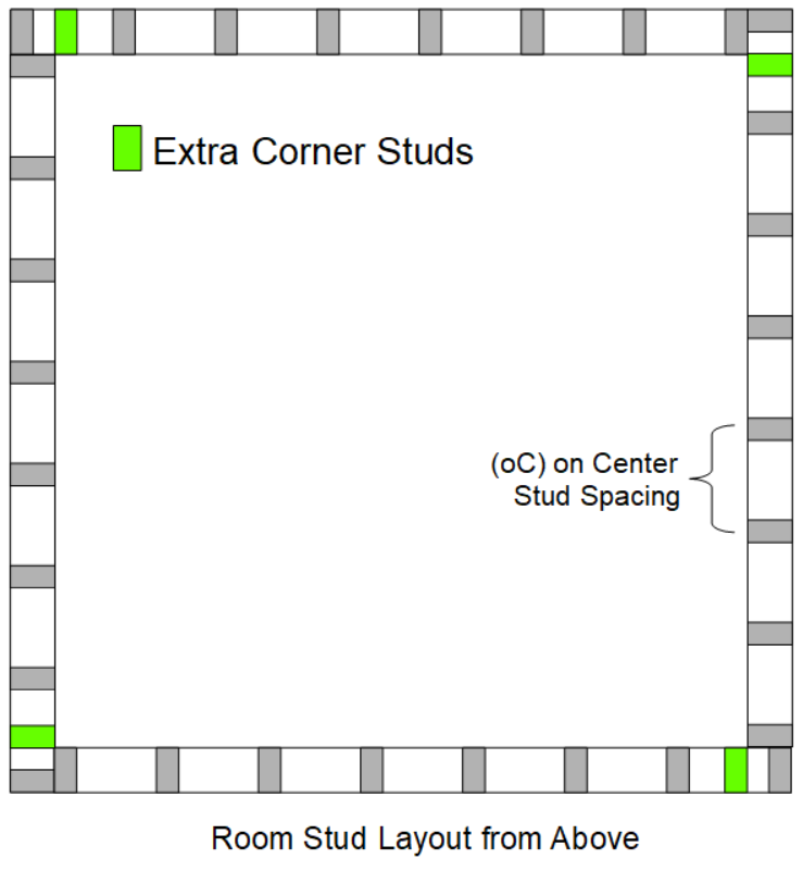 in a room is done by computing the number of studs needed in the four walls. Each wall has the first stud (1) plus the number of studs needed for spacing (oC) AND one additional stud in the corner. This additional stud is often forgotten by non-professionals. It is spaced two inches (2") away from the last stud and makes a nailing base in the corner with the first stud from the adjacent wall.
