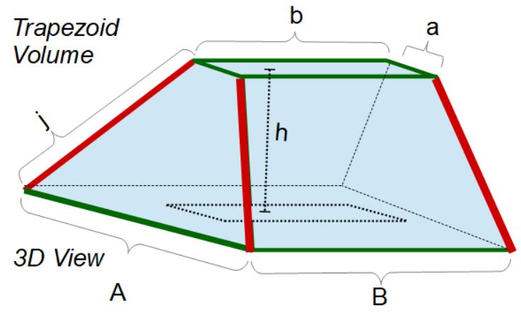 Trapezoid Volume (V): The calculator returns the volume in cubic meters. However, this can be automatically converted to compatible units via the pull-down menu.