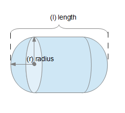 Geometrically, a capsule is a cylinder of any length (l) with two hemispheres on either end where the radius (r) of the cylinder is equal to the radius of the hemispheres. See diagram.