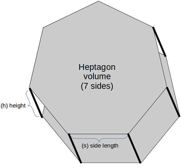 A regular heptagon has seven equal sides and equal angles. A heptagon volume is a heptagon shaped object with a regular heptagon cross-section (area) and perpendicular height.