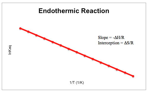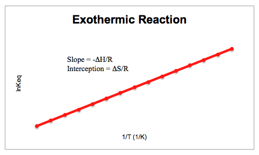 When the equilibrium constant and temperature are plotted against each other, both an exothermic and endothermic reaction will have a characteristic shape to its graph. Exothermic graphs tend to be linear with a positive slope, while endothermic reactions are linear with a negative slope, as shown below.