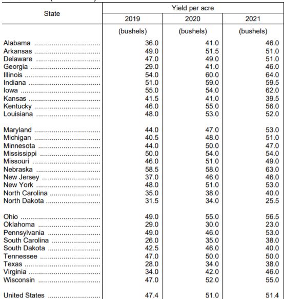 In the U.S. Department of Agriculture Crop Production 2021 Summary report, the following information on Yield per Acre.