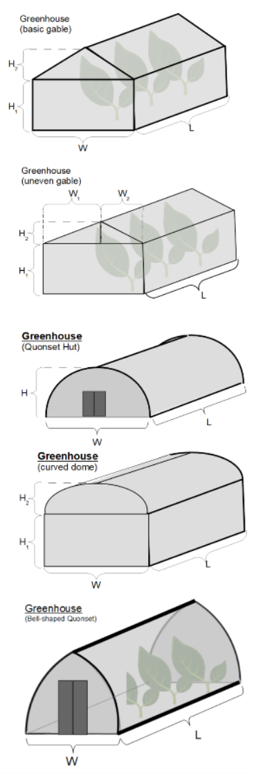 Greenhouse Volume (V) and Surface Area (SA): The volume is returned in cubic feet, and the surface area in square feet However, these can be automatically converted to compatible units via the pull-down menu.