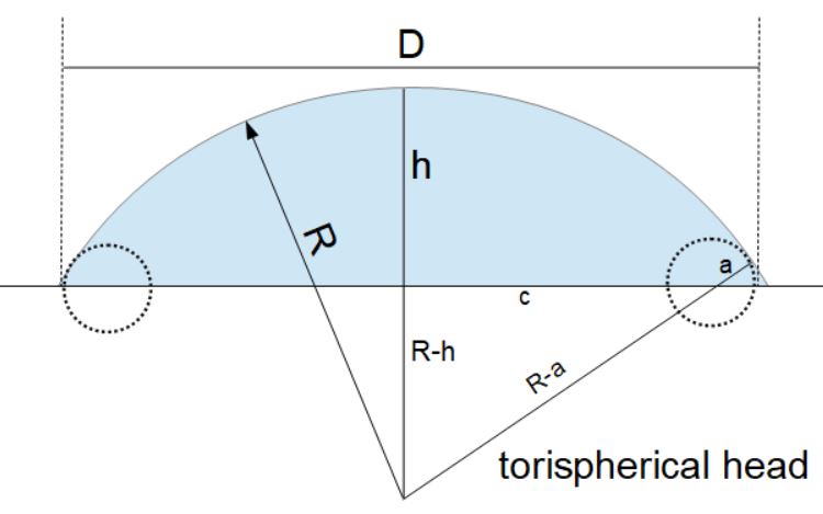 Volume of an Torispherical Head (V): The volume is returned in cubic centi-meters and the diameter is also returned in meters. However, these can be automatically converted to compatible units via the pull-down menu. The diameter of the head is also returned. The head height, knuckle radius and diameter are related.