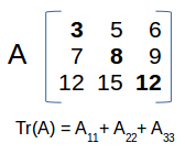 The trace of a square matrix (the matrix must be a square matrix) is simply the sum of the diagonals: `A_11 + A_22 +` ... `A_nn`.